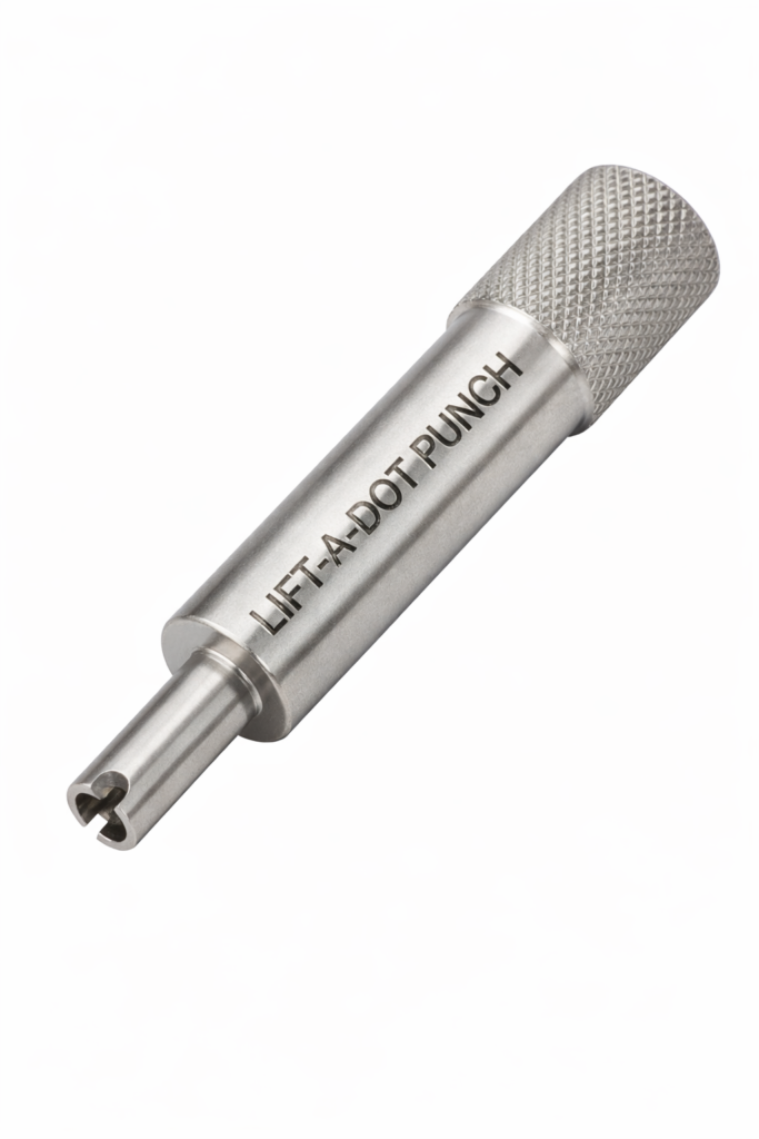 A Lift-a-Dot Punch is a specialized tool used to install Lift-a-Dot fasteners, which are commonly found on Austin Healey and other classic British cars. These fasteners are typically used to secure convertible tops, tonneau covers, side curtains, and interior trim panels.